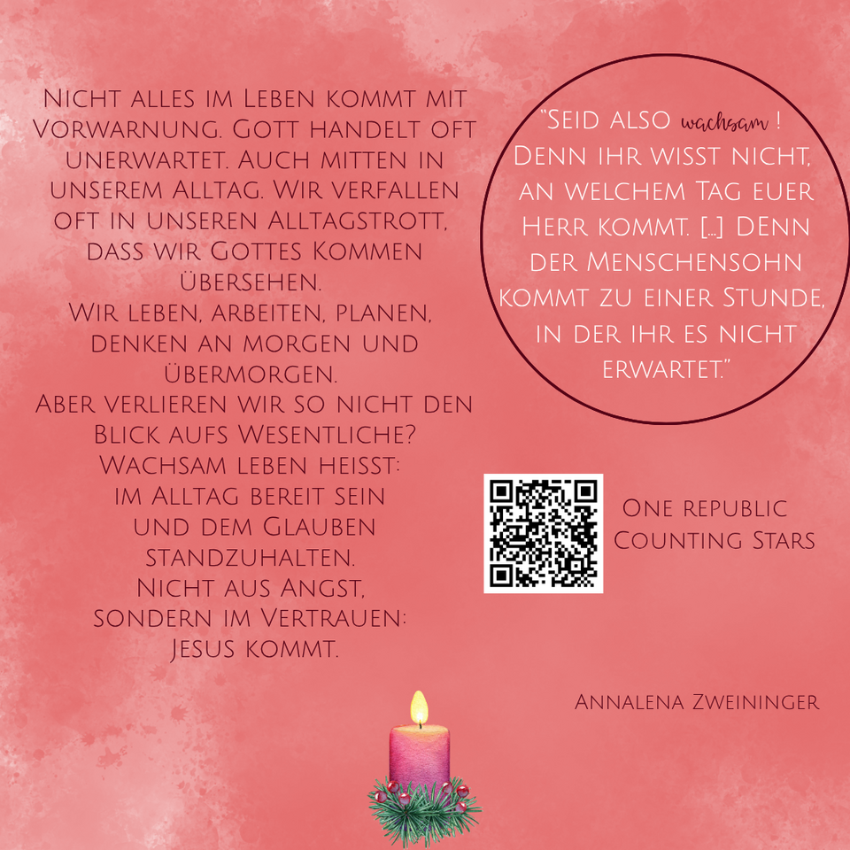 Ein spiritueller Begleiten durch Advent, Weihnachten und den Jahreswechsel. Die Karten sind ab dem 1. Advent erhältlich in den Kirchen des Pastoralverbundes.