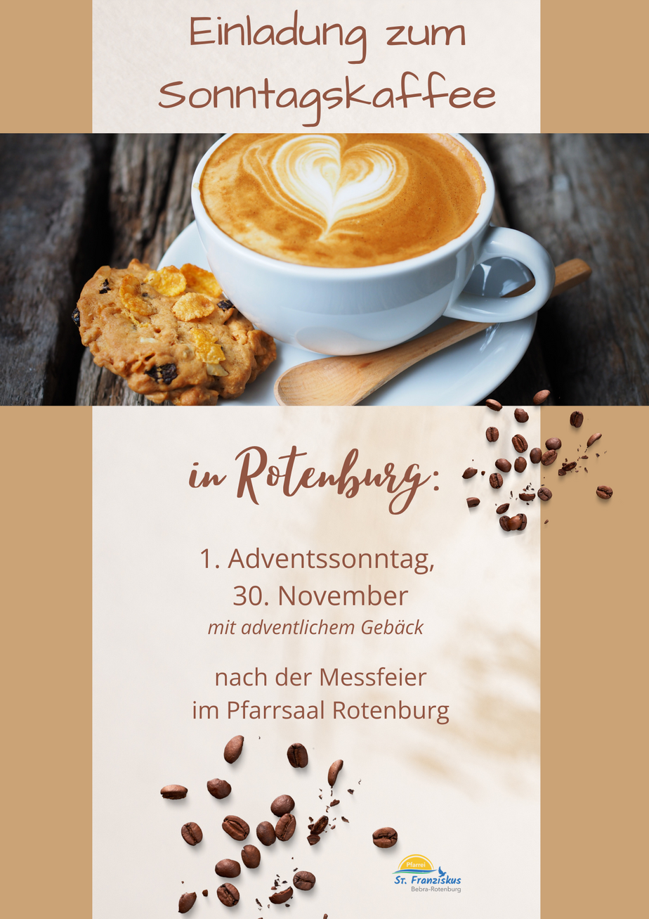 Bleiben Sie gerne nach der Messfeier am 30. November zum Sonntagskaffee im Pfarrsaal in Rotenburg.