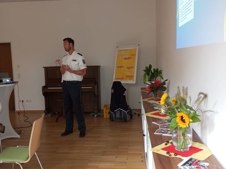 Er sensibilisierte die Anwesenden und zeigte Beispiele auf, wie man im Alltag wachsam und aufmerksam sein kann, um Taschendiebstahl zu verhindern.